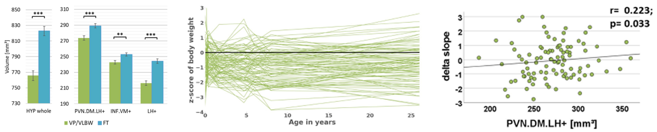 Figure 2. Top left: Smaller volumes of the entire hypothalamus and of substructures that contain nuclei involved in the control of body weight in adults born preterm. Top right: On average, relatively lower bodyweight gain from birth up to the age of 26 years after preterm birth; the zero line represents the typical trajectory for adults born at term – as a relative reference value. Bottom left: The lower bodyweight gain from birth to 26 years (measured as difference values delta) is associated with the smaller hypothalamic volume – the smaller the hypothalamus (specifically substructure 1+3 from Figure 1), the lower the bodyweight gain.