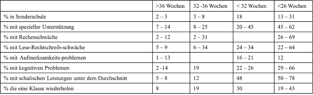 Ehemalige Frühgeborene haben ein erhöhtes Risiko für Probleme in kognitiven Leistungen, im Sozialverhalten und in ihrer Aufmerksamkeitsregulation als reif geborene Kinder. Diese Fähigkeiten sind sehr wichtig, damit Kinder lernen können und haben einen Einfluss auf den späteren Schulerfolg. Wie stark das Risiko für den Schulerfolg ist, hängt von der Schwangerschaftsdauer ab: zum Beispiel entwickelt nur ein kleiner Teil der moderat Frühgeborenen (Geburt in der 32. – 36. Schwangerschafts-woche) schulische Probleme, während jede verlorene Woche das Entwicklungsrisiko der sehr (< 32 Wochen) oder extrem früh (< 26 Wochen) geborenen Kinder bedeutend erhöht. Viele Eltern und Lehrer erwarten, dass ehemalige Frühgeborene den Rückstand zu ihren Altersgenossen bis zum Schuleintritt aufholen. Die Mehrheit der Frühgeborenen holt auch auf, während jene mit anhaltenden starken Entwicklungsproblemen im zweiten Lebensjahr häufiger noch langfristig kognitive und Schulprobleme haben.